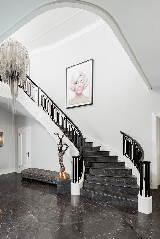 Betontreppe mit Steinstufen und Holzwangen, klassische Treppe mit Stahlgeländer