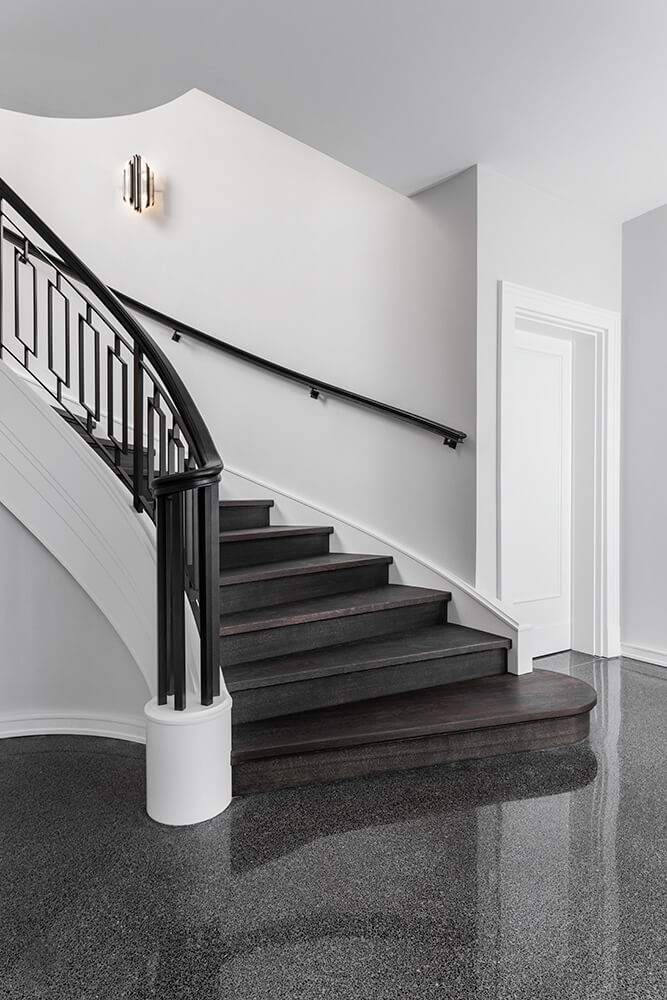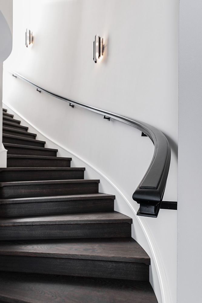 Betontreppe mit Holzverkleidung, klassische Treppe, Bogentreppe mit Stahlgeländer