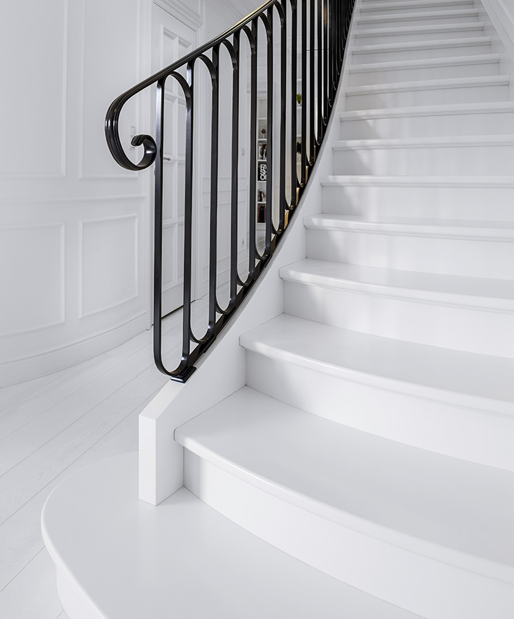 Holztreppe, klassische Treppe, Wangentreppe mit Stahlgeländer