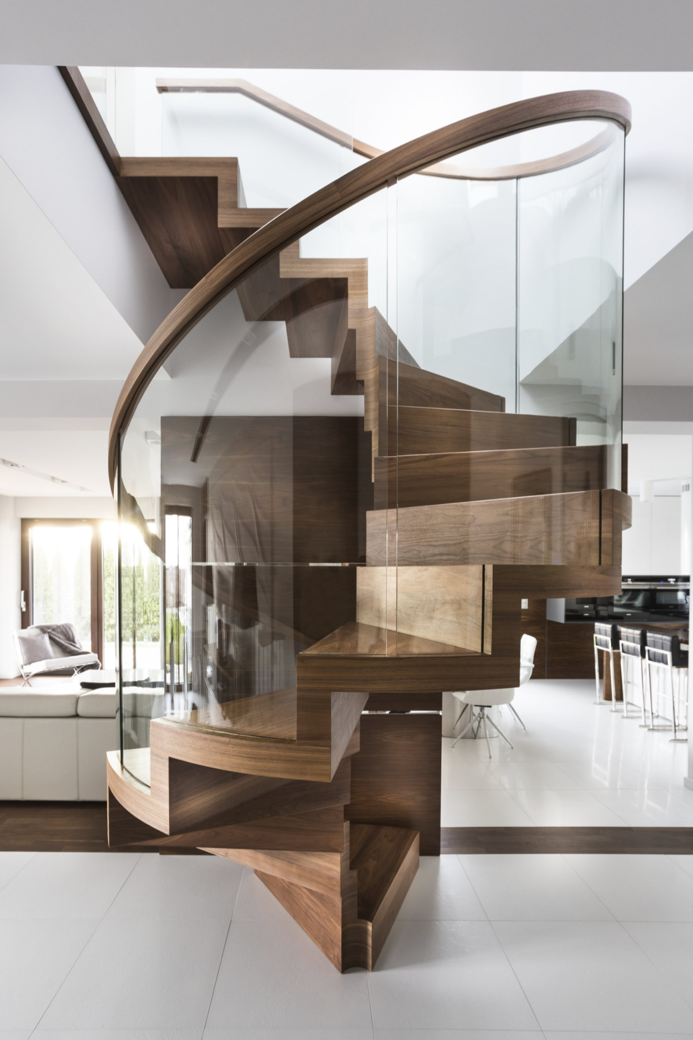Moderne Treppe, Wendeltreppe, Faltwerktreppe, Holztreppe mit Glasgeländer