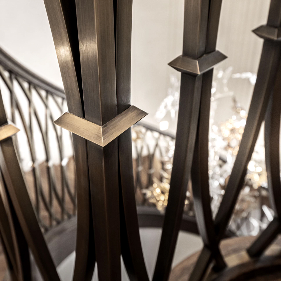 Dieses Projekt führte uns in die Welt der Mode, denn Tommy Hilfigers New Yorker Penthouse lieferte die Inspiration für die Treppenkonstruktion. Von dort stammt auch der Architekt Robert A. M. Stern, dessen Entwurf vom Architekturbüro Sebastian Treese ausgearbeitet und von markiewicz ausgeführt wurde. Besonders beeindruckt die elliptische Form der einzelnen brünierten Ornamente der Messingbalustrade und die harmonische Farbgebung. Die Bauherrschaft zeigte sich von der Oberfläche, dem einzigartigen Design und den Materialien begeistert.